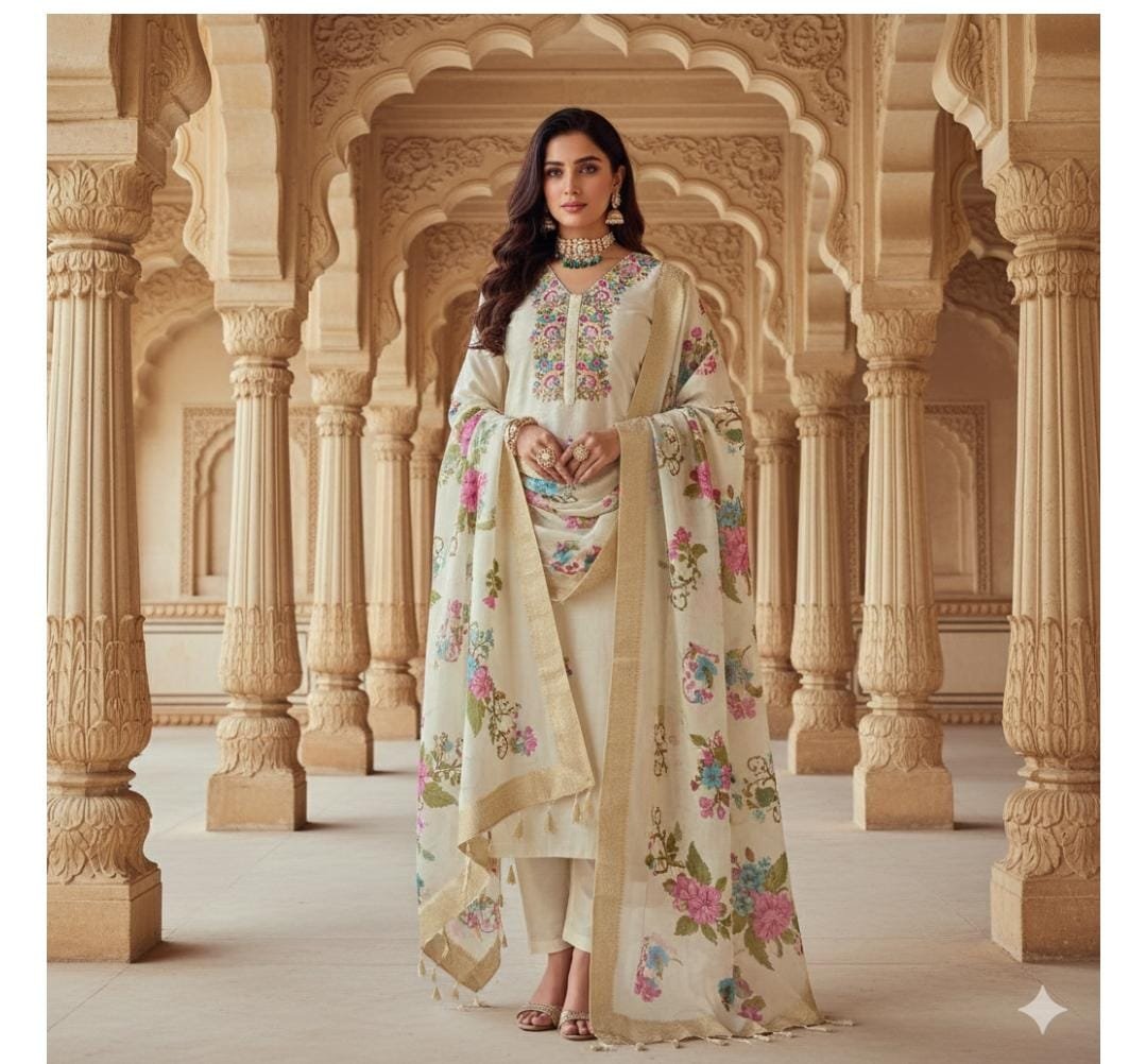 Be the first to review “Roman Silk Suit Set with Banarasi Dupatta (Off-White)” Cancel reply